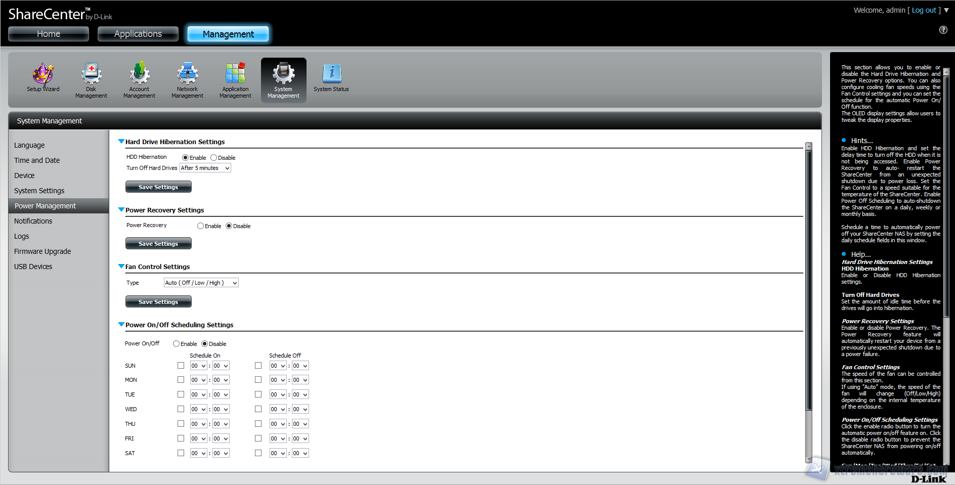 E’ possibile modificare parametri inerenti all’alimentazione ed all’accensione/spegnimento del DNS-320L.